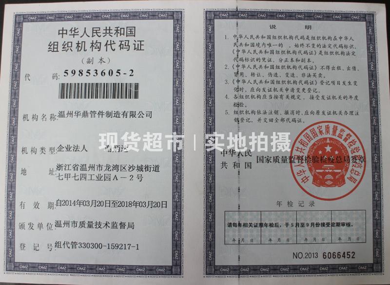 | 企業(yè)名稱(chēng) | 溫州華鼎管件制造有限公司 | 統(tǒng)一社會(huì)信用代碼 | 330303000095502 |