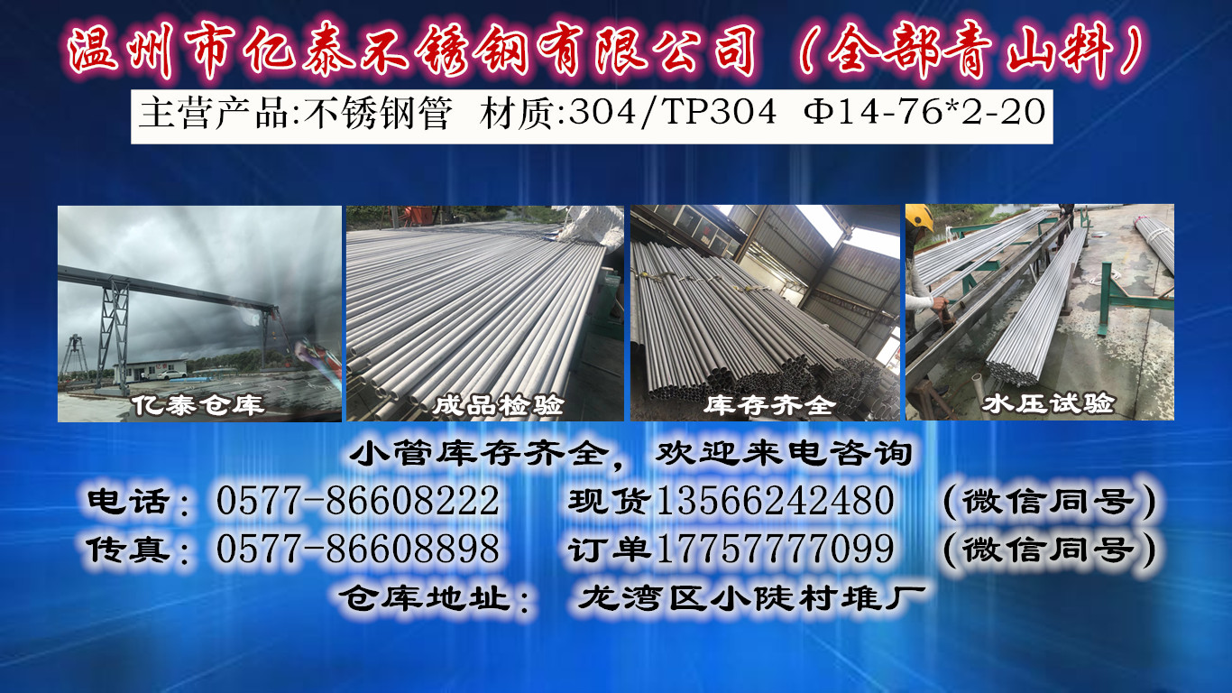 浙江盛洋不銹鋼有限公司是集生產(chǎn)銷售于一體的綜合性大型企業(yè)。專業(yè)生產(chǎn)各種型號的不銹鋼無縫管及工業(yè)無縫管,以TP304/304材質(zhì)為主。資源充足,品種齊全,庫存量大,價位特低,供貨時間最短 拼搏實干,開拓創(chuàng)新,積極進取,合作共贏的原則,以優(yōu)質(zhì)的服務(wù),靈活的經(jīng)營模式開拓市場,在廣大新老客戶的協(xié)助支持下,不斷發(fā)展壯大。誠信是企業(yè)的生命,您的需要是我們的立業(yè)之本! 電話:0577-86608222 熱忱歡迎廣大新老客戶蒞臨指導(dǎo)!