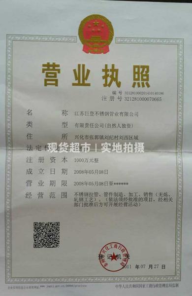 | 企業(yè)名稱 | 江蘇巨登不銹鋼管業(yè)有限公司 | 統(tǒng)一社會(huì)信用代碼 | 321281000070665 |