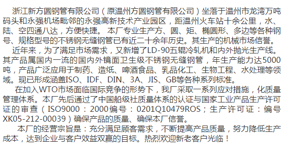 浙江新方圓鋼管專業(yè)生產(chǎn)TP316L不銹鋼無(wú)縫圓管、方矩管,高品質(zhì)換熱器管 |